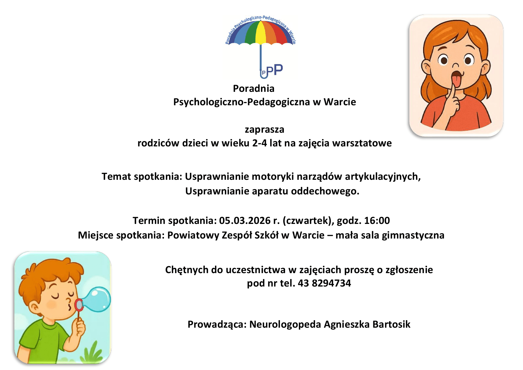 W imieniu Pani Agnieszki Bartosik (neurologopeda), zapraszamy na zajęcia warsztatowe dla rodziców dzieci w wieku 2-4 lat. Tematem spotkania będzie usprawnianie motoryki narządów artykulacyjnych i usprawnianie aparatu oddechowego.